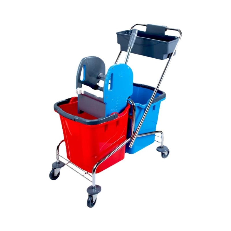 Duplavödrös takarítókocsi acél vázzal. Kényelmes kialakítás a nagy padlófelületek takarítására.